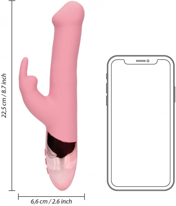 Ярко выраженная головка вибратора точечно воздействует на G-зону, блок металлических шаров в стволе интенсивно ласкают стенки лона при вращении, а клиторальный стимулятор в виде зайки с ушками значительно увеличивает накал страсти, работая снаружи!